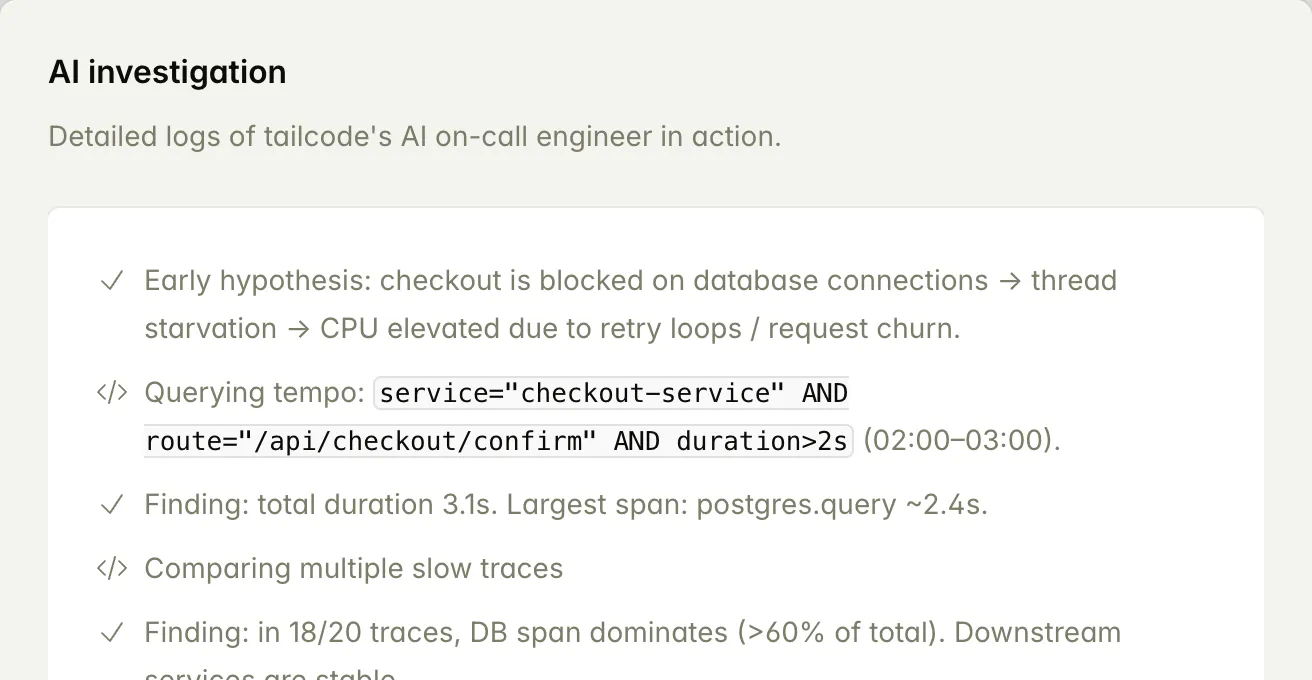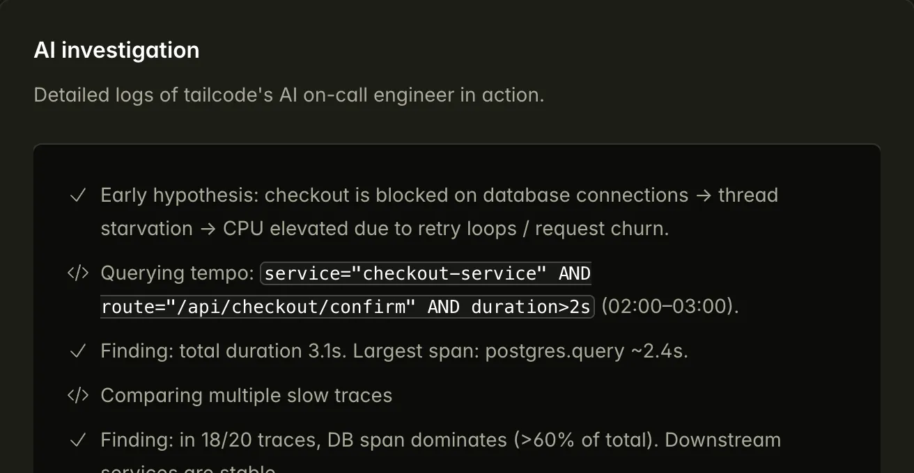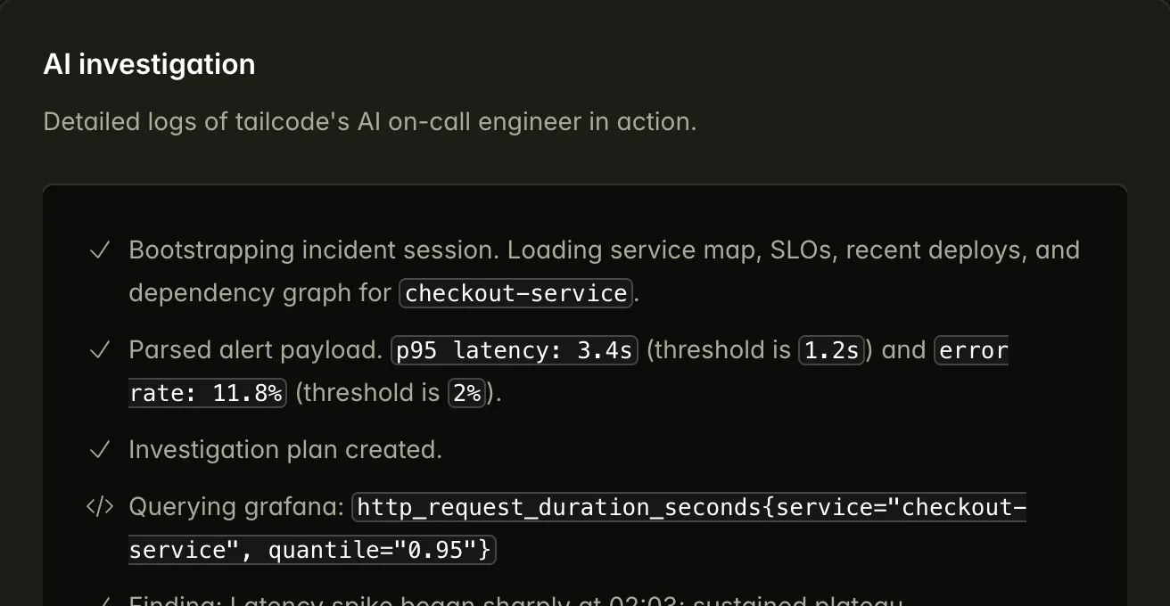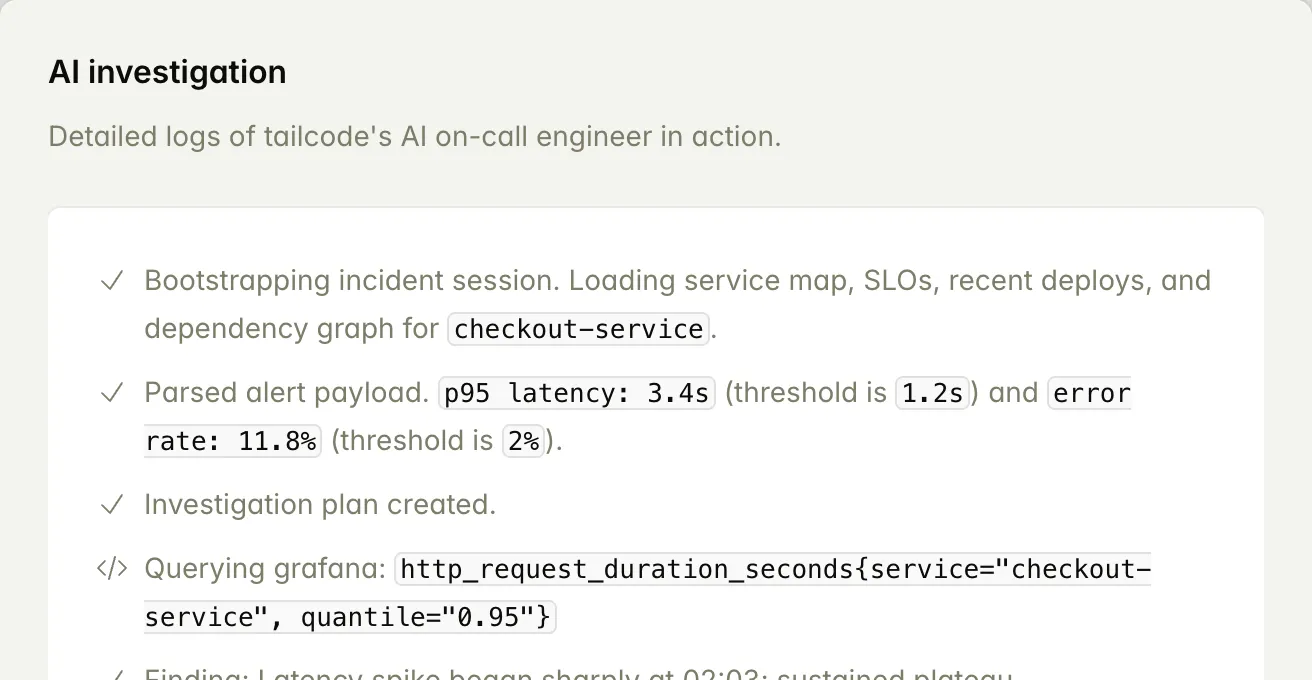 Our AI on-call engineer changes that by automatically gathering signals, correlating them into a clear explanation, and delivering answers and next steps directly inside your existing workflow. Teams resolve incidents faster, spend less time on repetitive investigation, and build operational knowledge that reduces repeat failures over time.