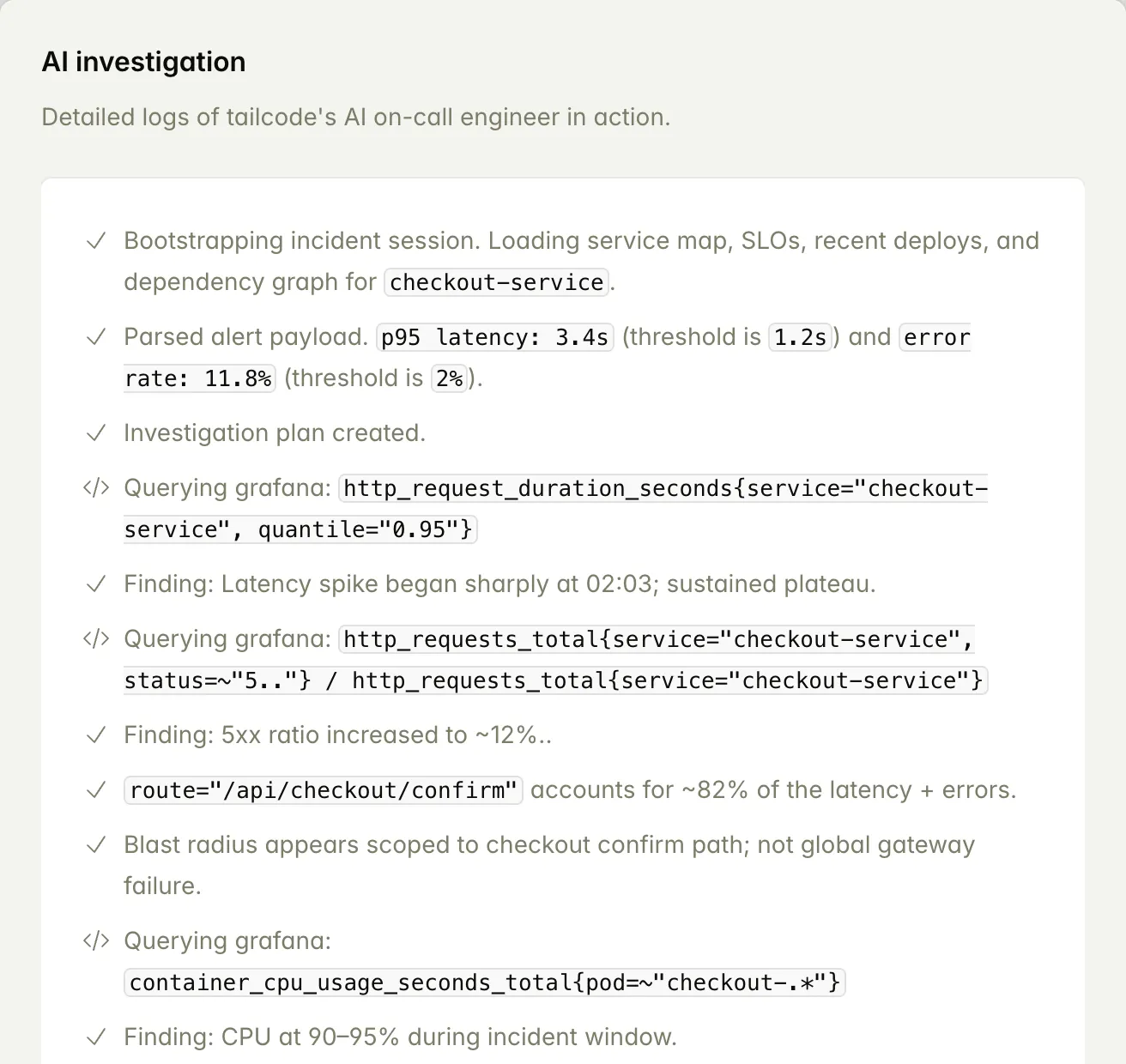 When an alert fires, our AI agent automatically gathers logs, metrics, alerts, and recent deploys. No manual digging. No tool switching.