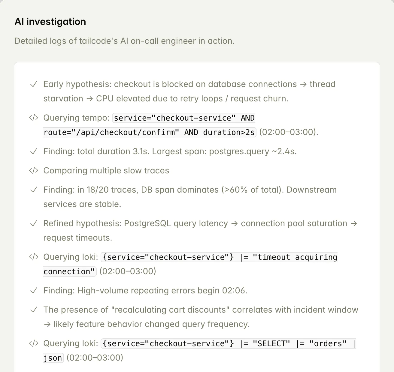 Analyzes and correlates signals across your stack to identify the most likely root cause and explain how the incident unfolded.