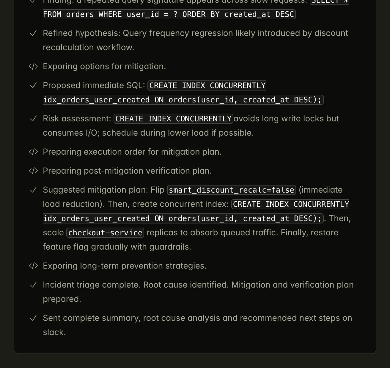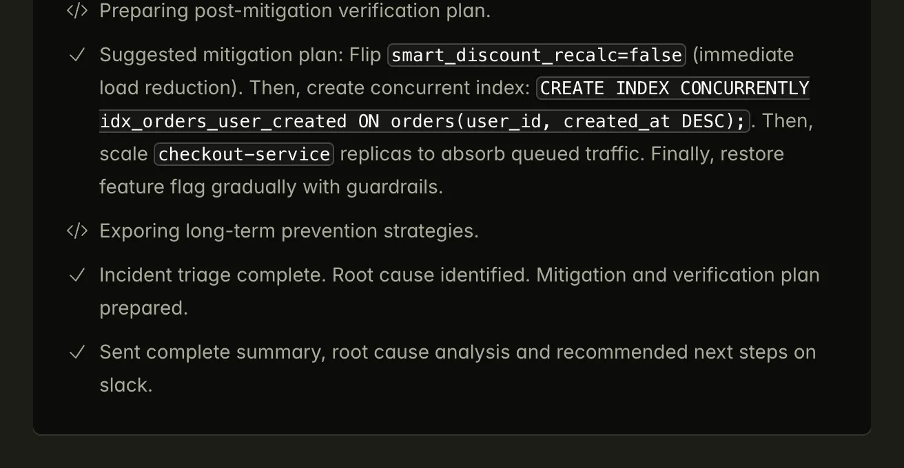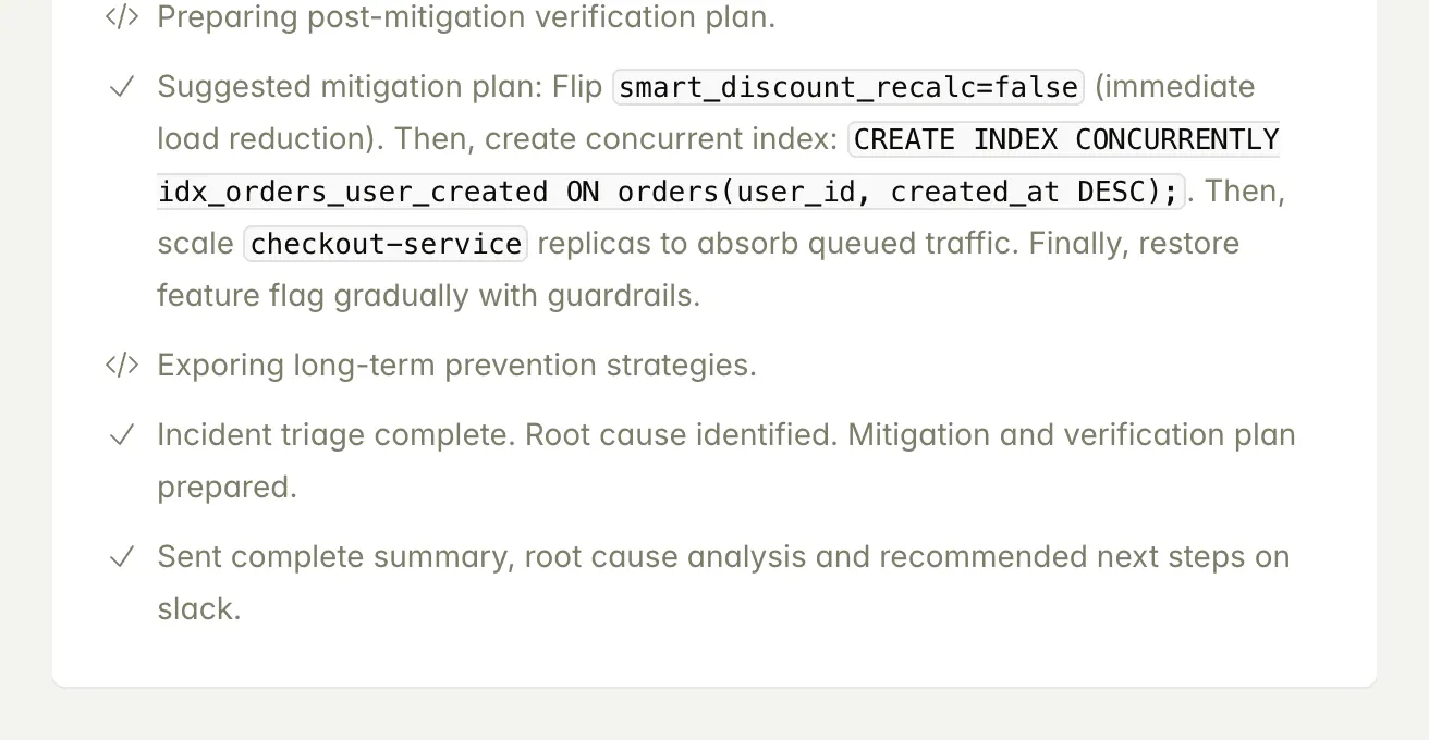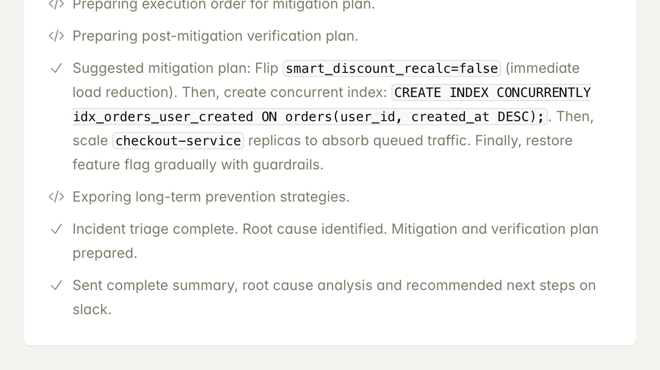 Delivers clear answers, impact, and recommended next steps directly in Slack, Teams, or your incident channel.